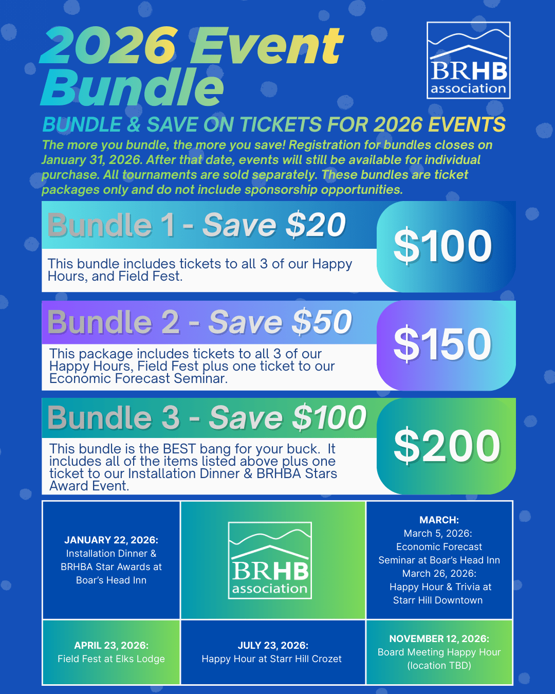 Our Event Ticket Bundles are designed to help you stay connected, grow your network, and make the most of your Blue Ridge Home Builders Association membership. By bundling tickets, you’ll enjoy exclusive savings while ensuring your spot at our most popular events throughout the year. Whether you’re looking to strengthen relationships, build new business connections, or simply get more involved, these bundles offer the best value and convenience for active members.